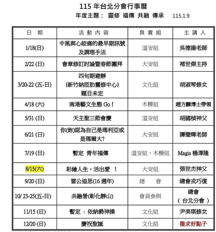 | 活動內容 | 中華基督神修小會台中分會行事曆114.1—114.12 年度主題:靈修,福傳,共融,傳承